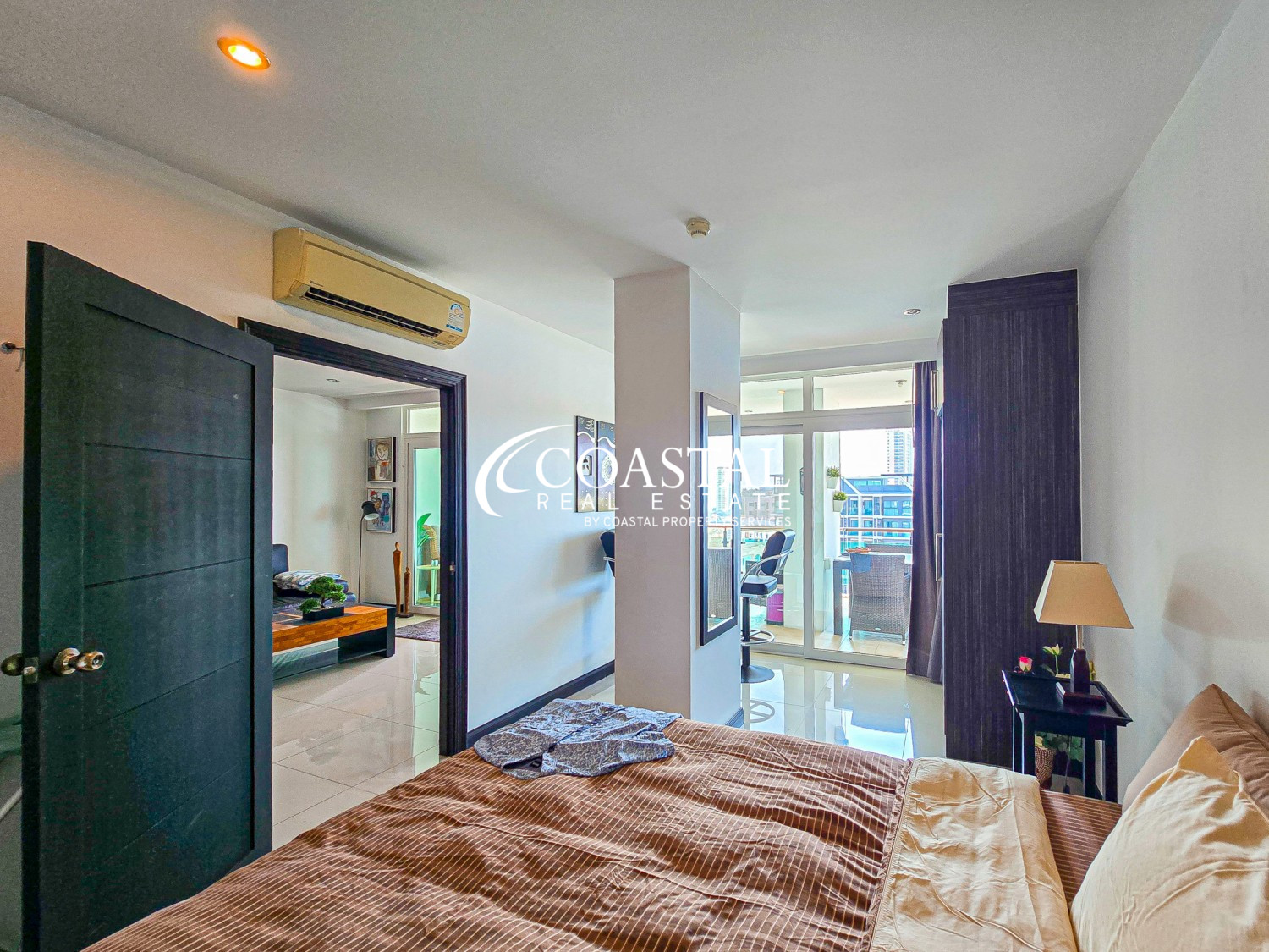 The living area extends seamlessly toward the private balcony, where residents can relax and enjoy pleasant sea views along with the surrounding cityscape of Pratumnak. The balcony space is ideal for outdoor dining, morning coffee, or simply unwinding while enjoying the refreshing sea breeze.