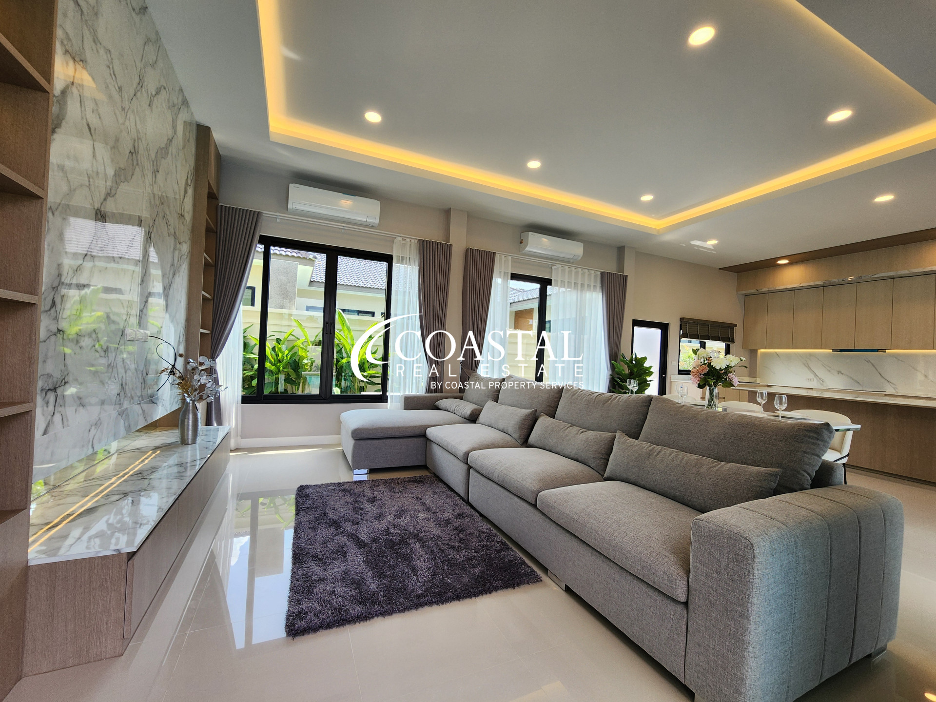 This single-story house for sale is located in the peaceful and well-maintained community of Garden Ville 9 in East Pattaya, offering a comfortable and modern lifestyle in a desirable residential area.