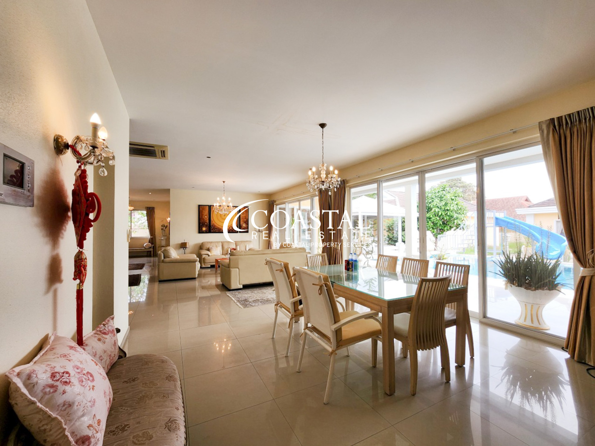 This stylish house for rent in East Pattaya offers a luxurious and comfortable lifestyle with a total living area of 769 square meters. The main house features three bedrooms, two bathrooms, a European kitchen, a living and dining area, a laundry room, and a storage room, providing ample space for family living.