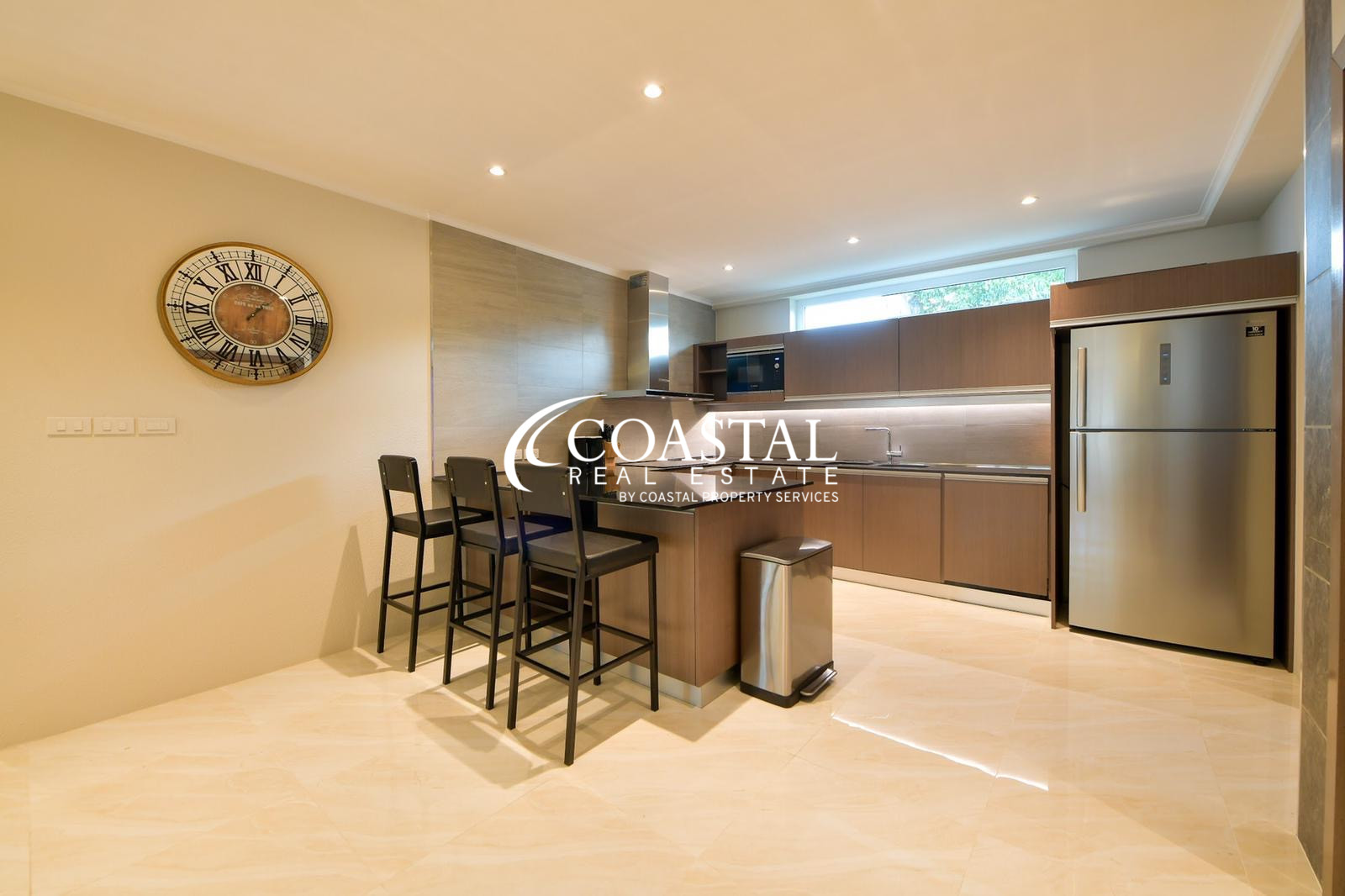 The European style kitchen is fully equipped with modern appliances, including a double door refrigerator, microwave, oven, dishwasher, and ample storage. This space is well suited for everyday cooking as well as entertaining.
