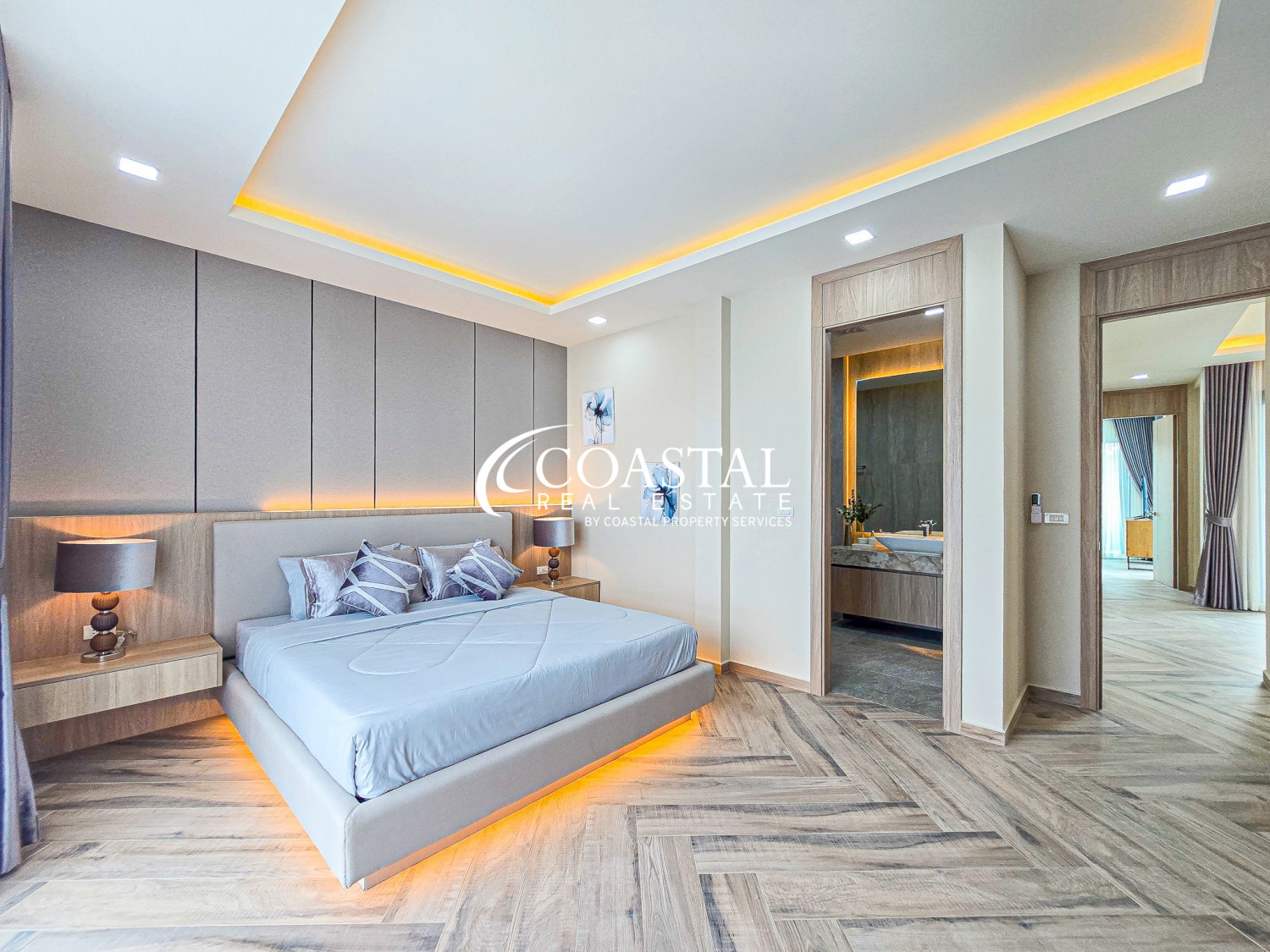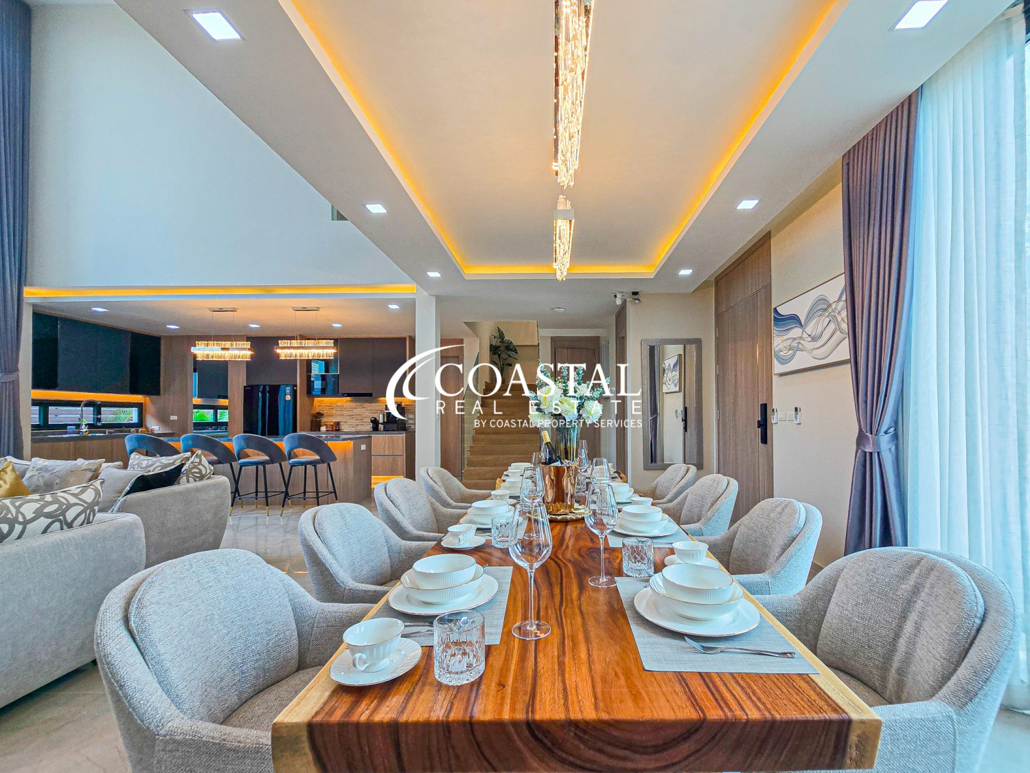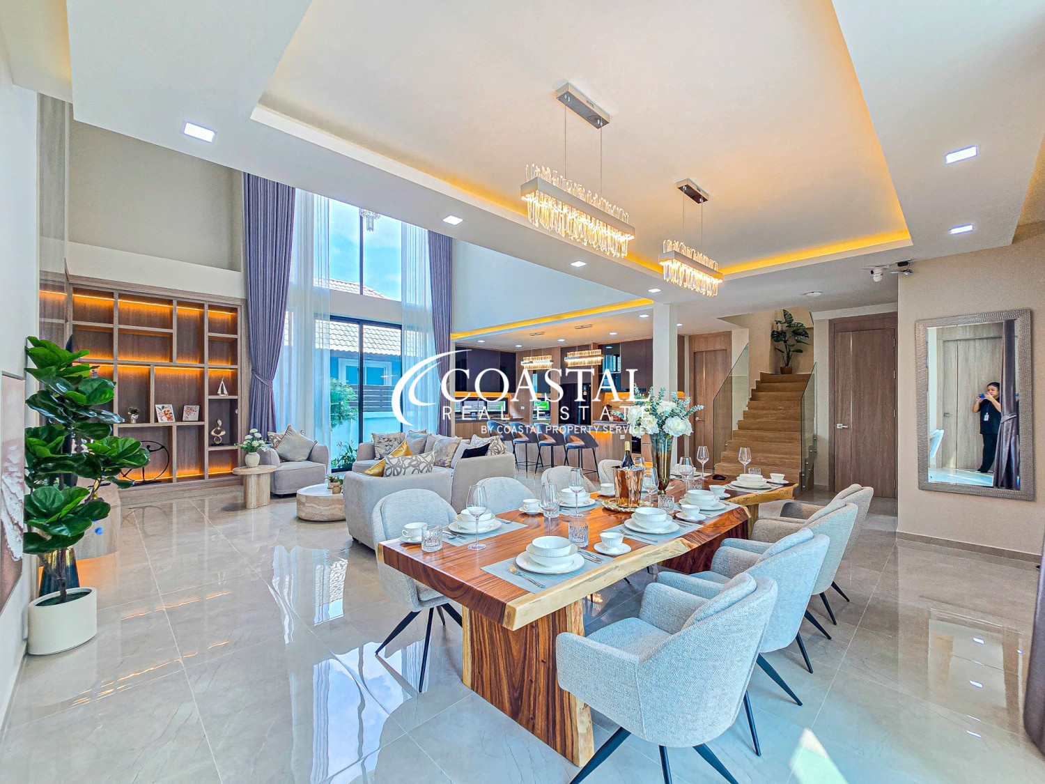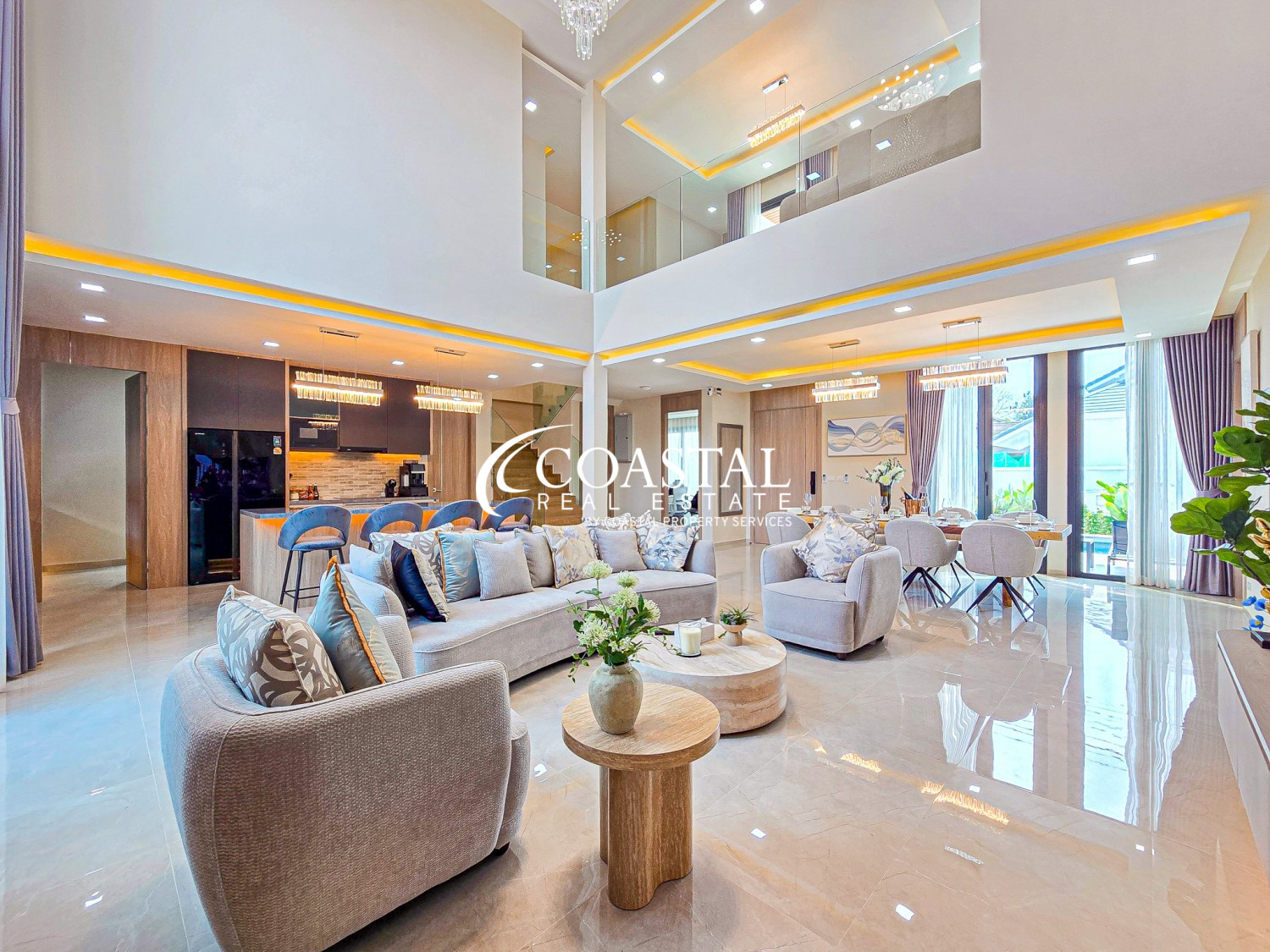 This modern home offers 330 square meters of living space with five bedrooms and five bathrooms, designed to suit comfortable family living as well as entertaining. The main living area features impressive double height ceilings and large windows that bring in plenty of natural light, creating a bright and welcoming feel throughout the home. Several rooms open onto private balconies with views of the garden and pool.