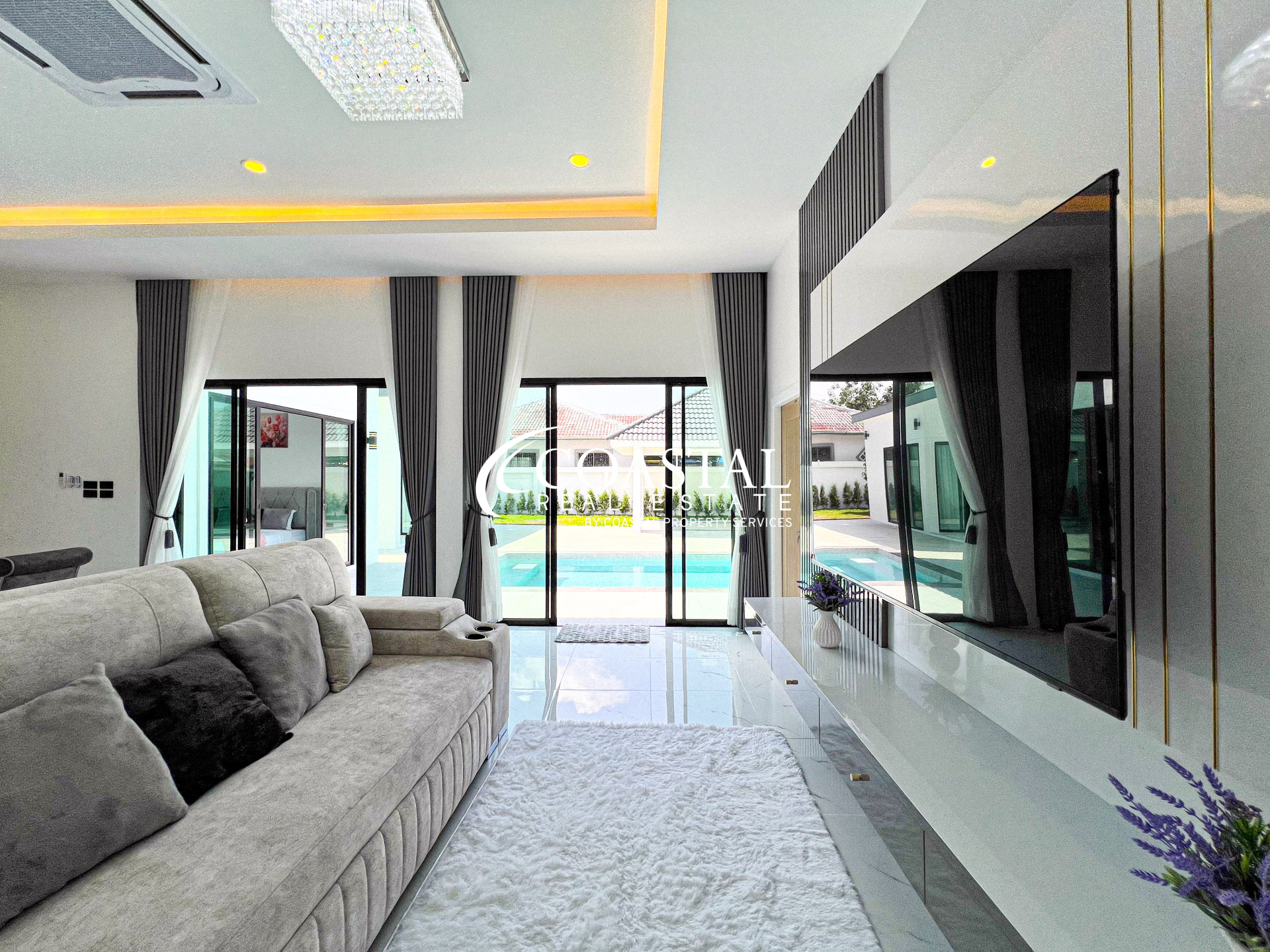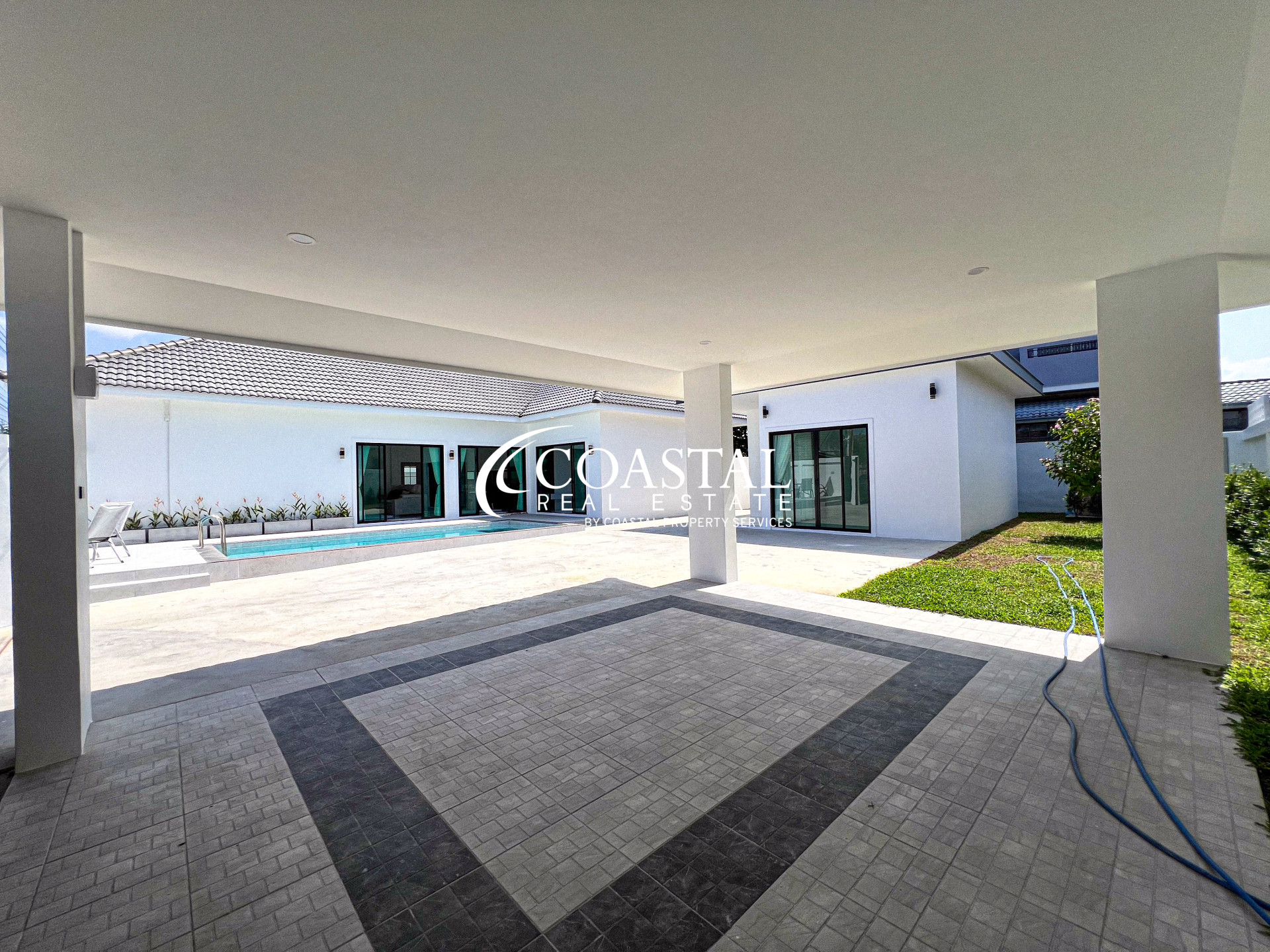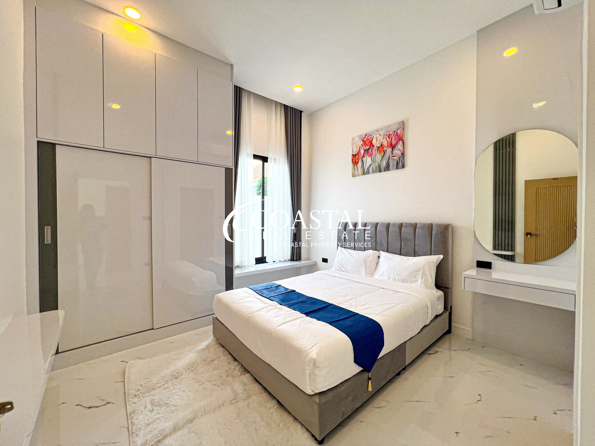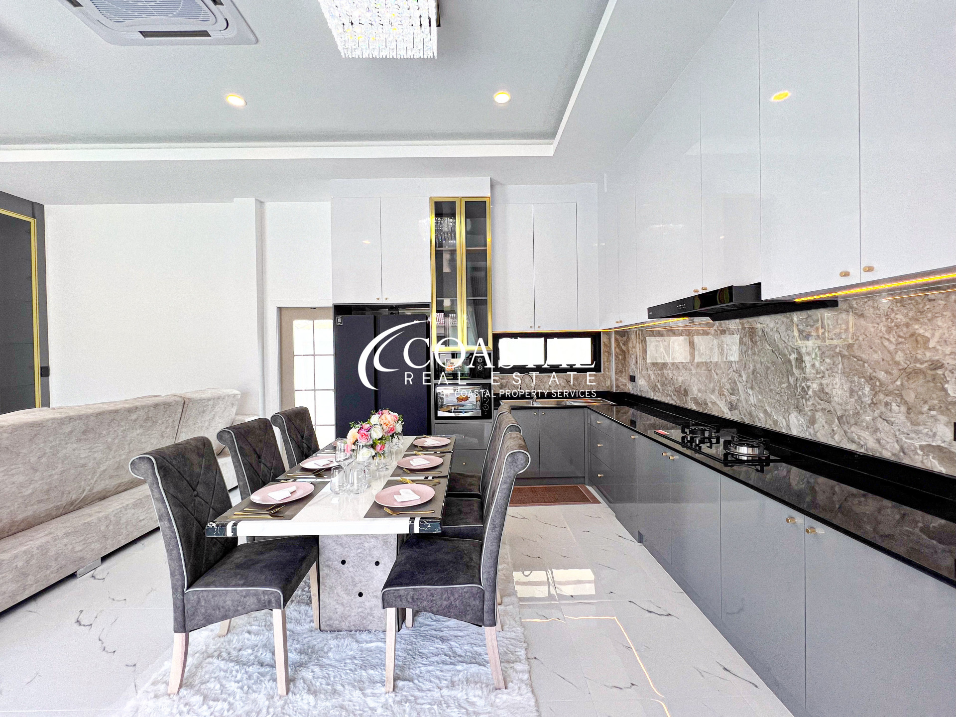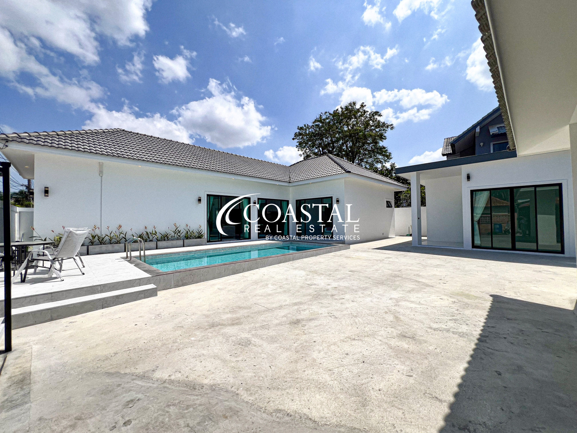 This single story house for sale in East Pattaya offers a comfortable and well-designed living space, ideal for families or those seeking a peaceful lifestyle. The property features a living size of 144 square meters, comprising 4 bedrooms including 3 bedrooms in the main house and 1 separate guesthouse, along with 5 bathrooms. It comes fully furnished and is equipped with a modern European kitchen, providing both functionality and style for everyday living.