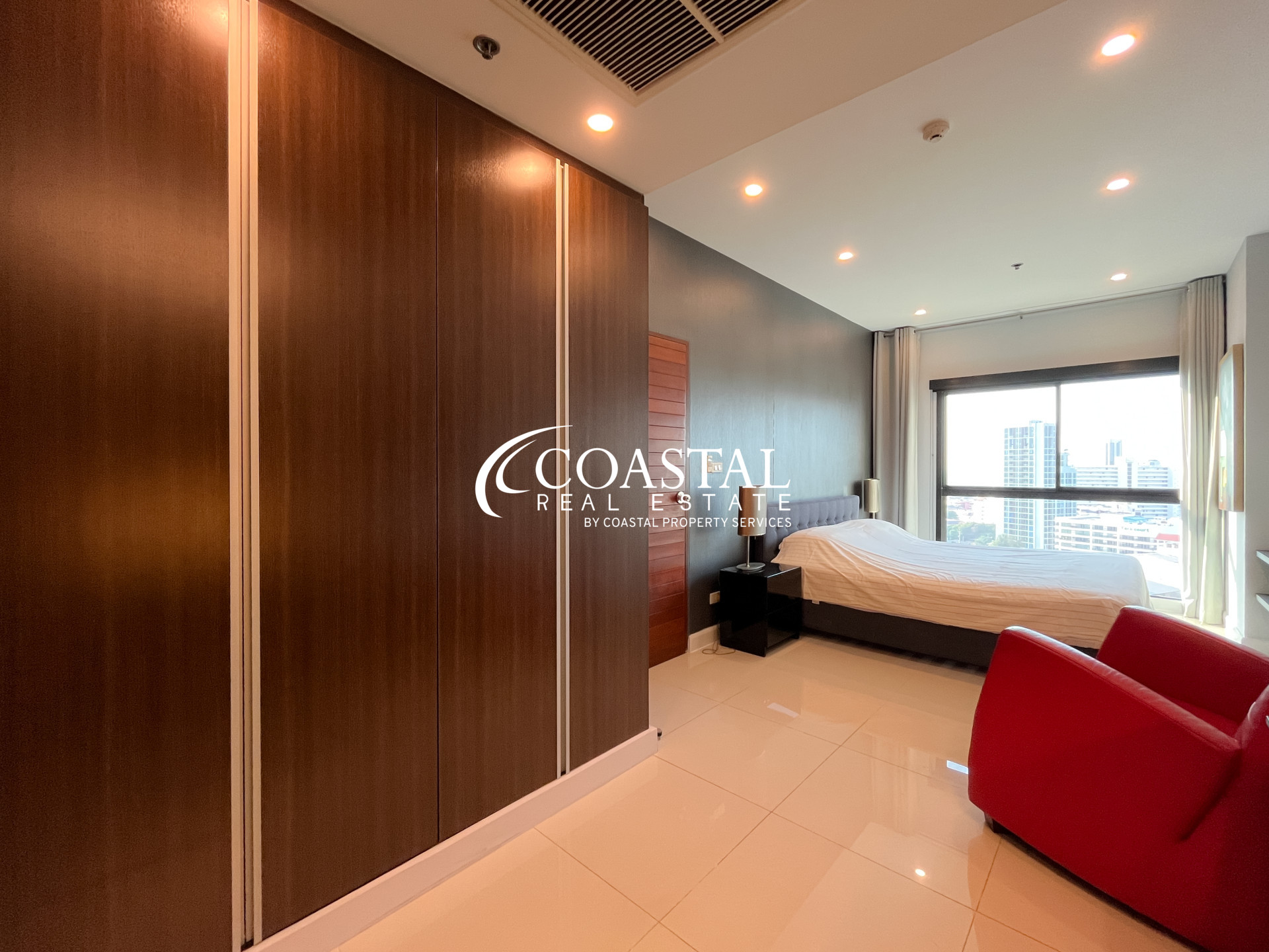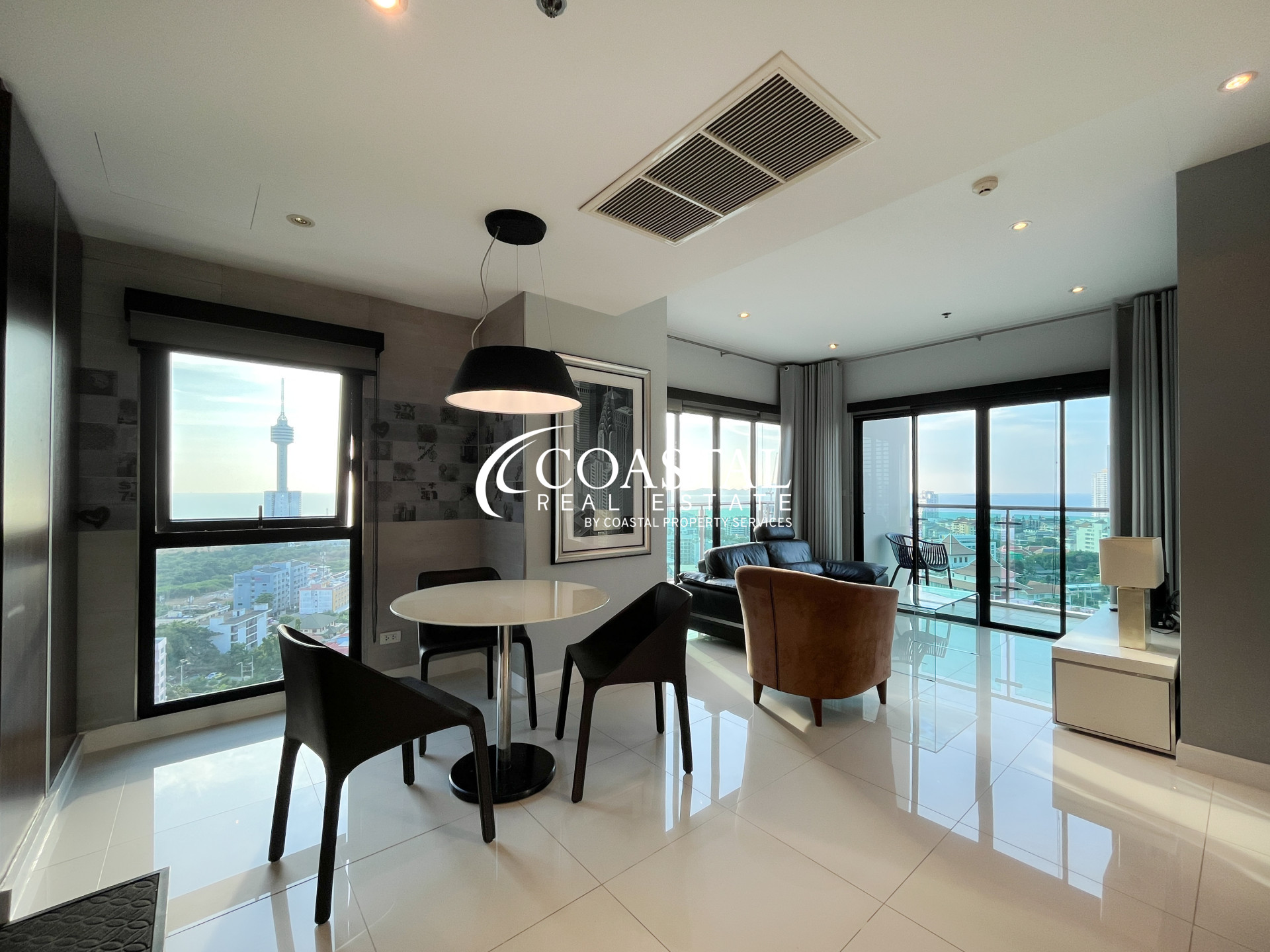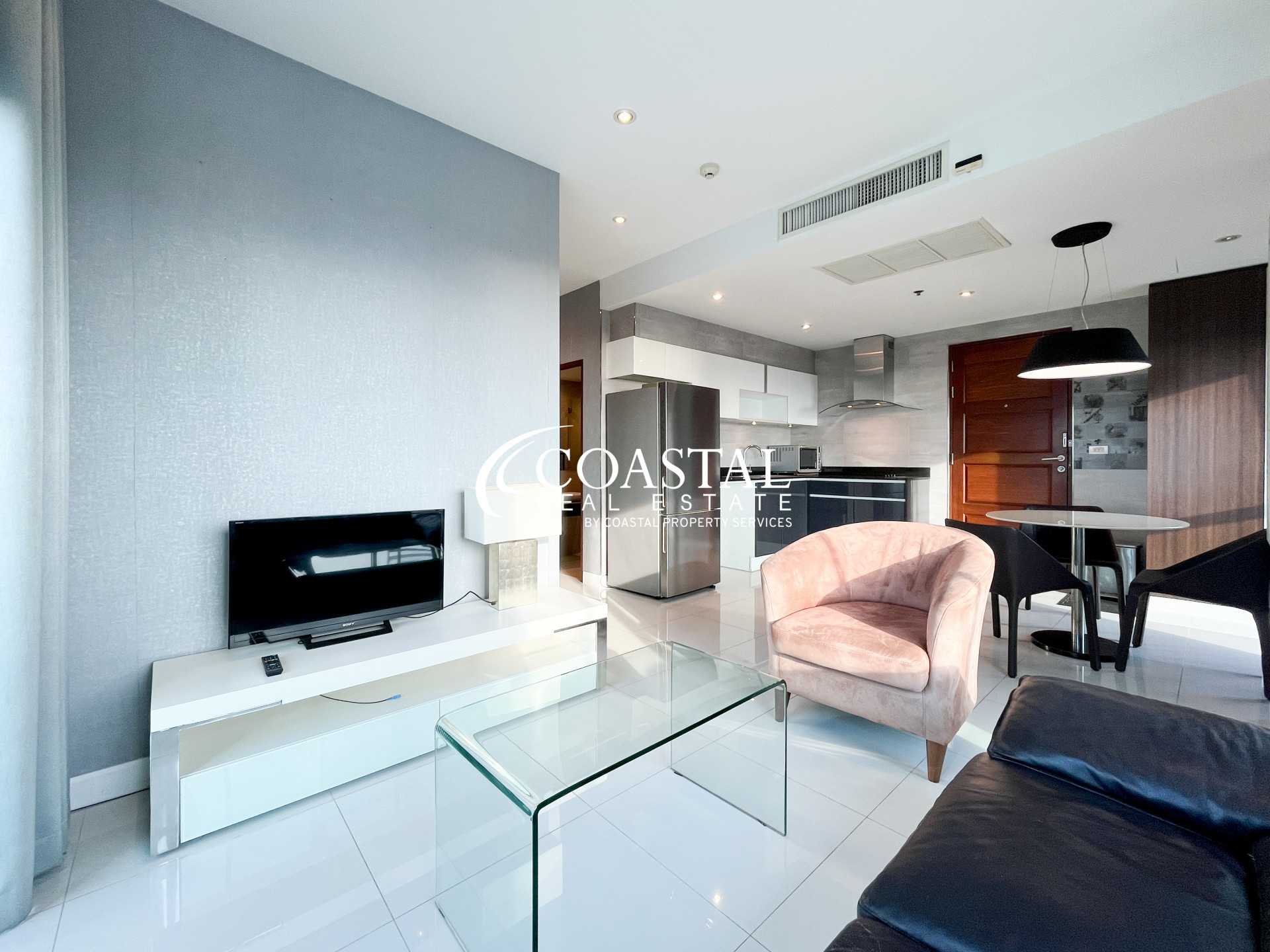 คอนโดขนาด 76 ตารางเมตร 2 ห้องนอน 2 ห้องน้ำ เสนอขายพร้อมเฟอร์นิเจอร์ครบครัน มีครัวสไตล์ยุโรป และระเบียงส่วนตัว 2 ระเบียงพร้อมวิวเมืองและวิวทะเล