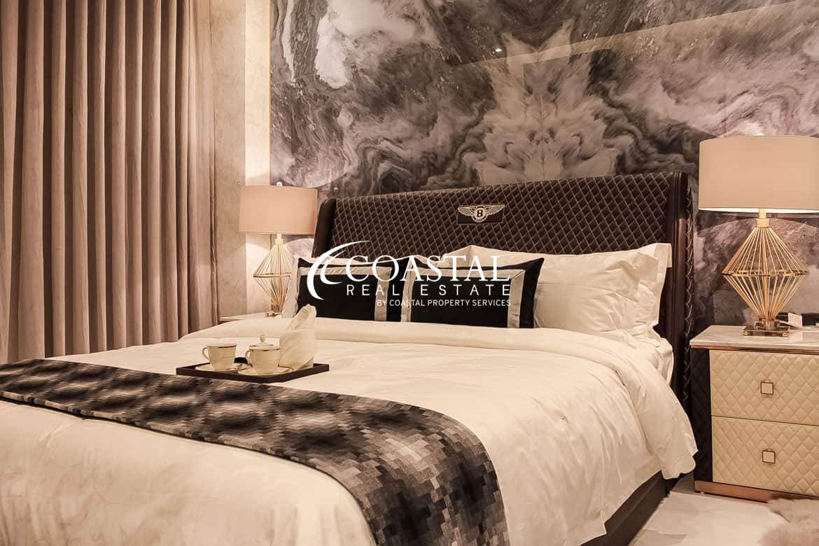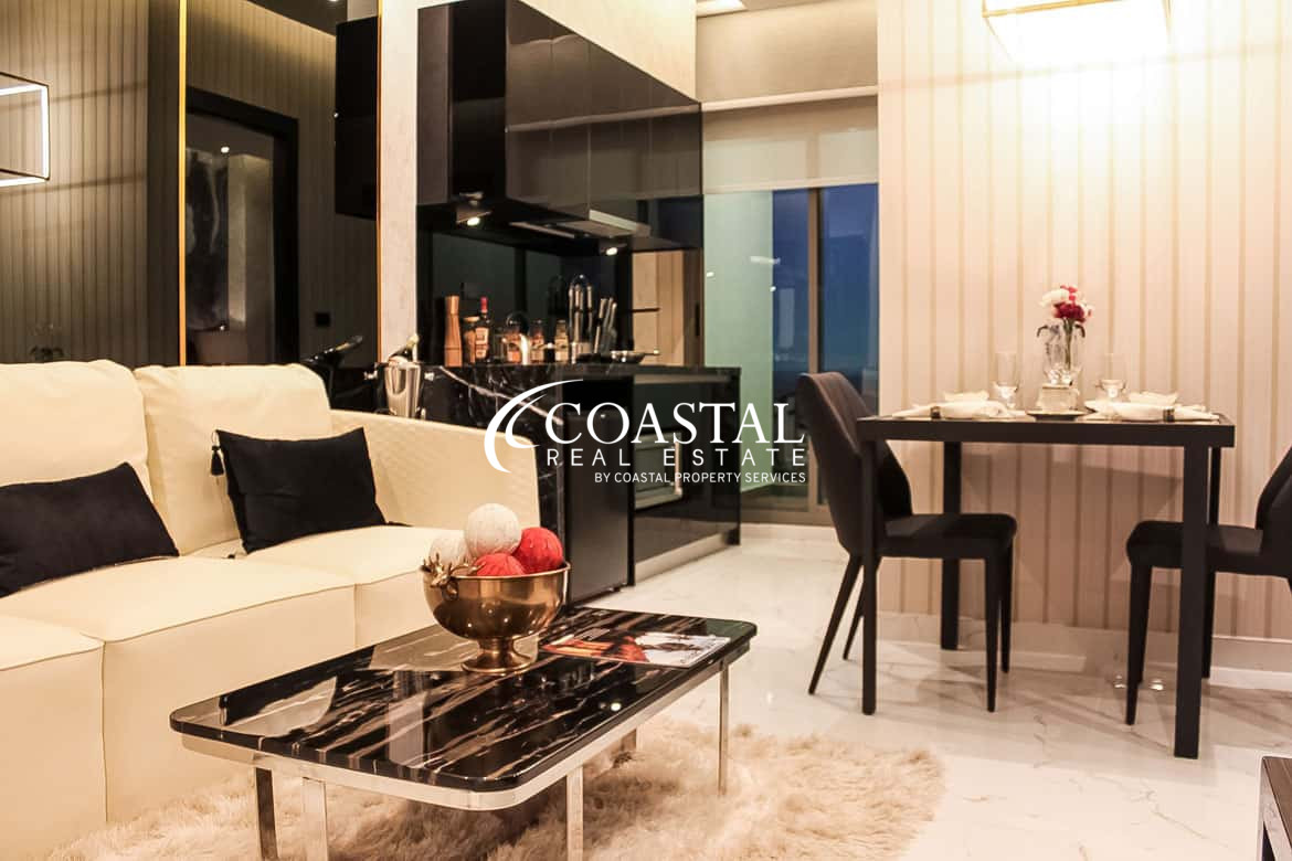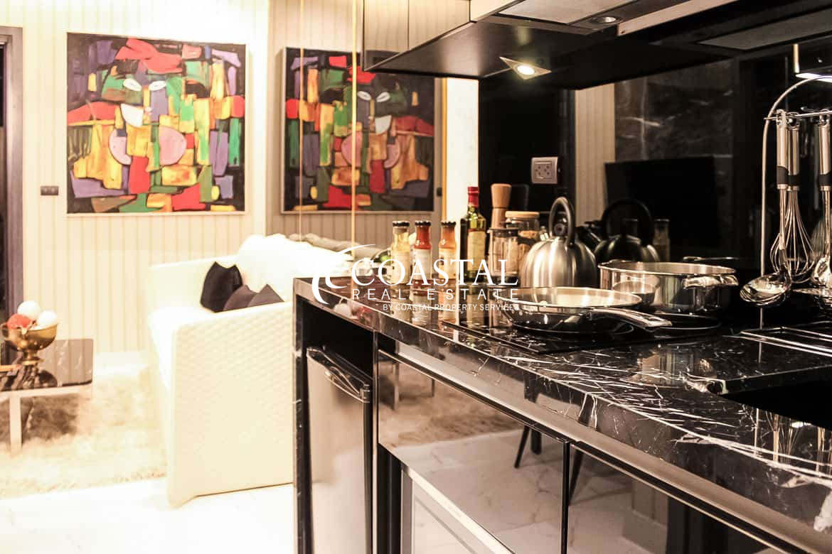 พื้นที่ใช้สอยขนาด 45 ตร.ม. ตกแต่งพร้อมเฟอร์นิเจอร์ครบครัน ห้องครัวสไตล์ยุโรป และระเบียงส่วนตัวพร้อมวิวทะเลจอมเทียน